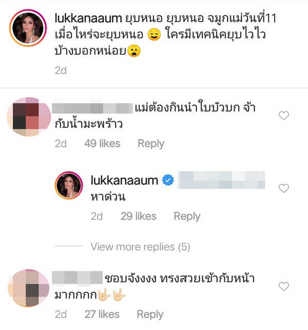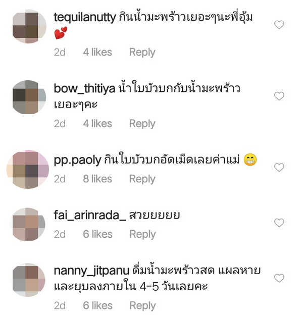 งานนี้บรรดาแฟนคลับต่างก็เข้ามาแนะนำวิธีทำให้แผลยุบเร็ว ๆ กันมากมาย บางคนบอกว่าให้ดื่มน้ำใบบัวบกกับน้ำมะพร้าว ก็จะช่วยลดอาการบวมได้ ส่วนบางคนก็เข้ามาชมว่าทำจมูกใหม่แล้วหน้าเด็กลงเลยทีเดียว