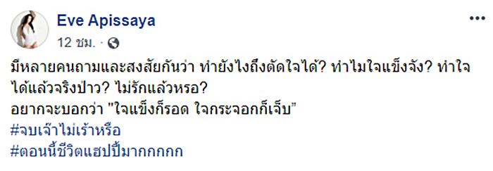 ทั้งนี้ หลายคนยังตั้งคำถามว่า อีฟ จะเลิกกับเสกจริงหรือเปล่า เดี๋ยวก็คงกลับไปคืนดีกันหรือไม่ หรือมีวิธีตัดใจจากเสกอย่างไรบ้าง ล่าสุด (9 ตุลาคม 2562) อีฟ อภิสร์ญา ได้โพสต์รูปสุดเซ็กซี่ลงเฟซบุ๊ก พร้อมตอบคำถามที่หลายคนอยากรู้ระบุว่า มีหลายคนถามและสงสัยกันว่า ทำยังไงถึงตัดใจได้ ทำไมใจแข็งจัง ทำใจได้แล้วจริงหรือเปล่า ไม่รักแล้วเหรอ อยากจะบอกว่า "ใจแข็งก็รอด ใจกระจอกก็เจ็บ" จบเจ๊าไม่เร้าหรือ ตอนนี้ชีวิตแฮปปี้มาก