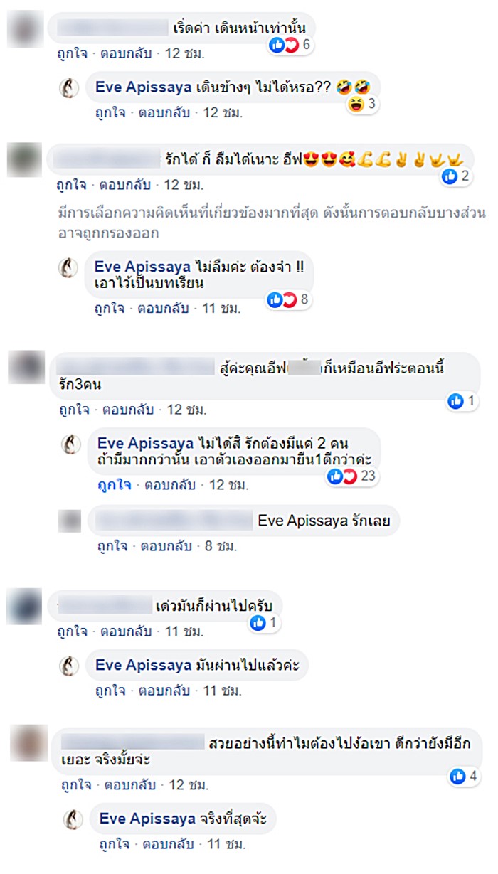 อย่างไรก็ตาม อีฟได้คอมเมนต์ตอบชาวเน็ตหลายคนที่เข้ามาให้กำลังใจ เช่น บางคนบอกว่ารักได้ก็ลืมได้ แต่เจ้าตัวตอบว่า ตนจะไม่ลืมและต้องจำไว้เป็นบทเรียน บ้างก็บอกให้อีฟสู้ ๆ เพราะเขาก็กำลังประสบปัญหาเหมือนอีฟเรื่องรัก 3 คน ซึ่งอีฟได้เข้ามาตอบแบบสาวสตรองว่า "ไม่ได้สิ รักต้องมีแค่ 2 คน ถ้ามีมากกว่านั้น เอาตัวเองออกมายืน 1 ดีกว่าค่ะ" บ้างก็บอกว่าให้สู้ ๆ เดี๋ยวมันก็ผ่านไป ขณะที่อีฟบอกว่ามันผ่านไปแล้ว