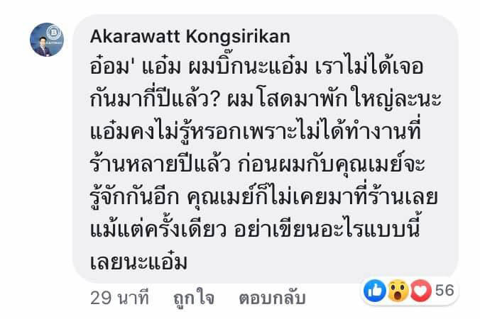 ด้านไฮโซบิ๊กเองก็ถึงกับทนไม่ไหว มาออกสนามนี้ด้วยตัวเอง โดยเข้ามาคอมเมนต์ว่า ผมบิ๊กนะแอ๋ม เราไม่เจอกันมากี่ปีแล้ว ตนโสดมาสักพักแล้ว และแอ๋มคงไม่รู้เพราะแอ๋มไม่ได้ทำงานกับตนมาหลายปี แอ๋มออกไปตั้งนานก่อนที่ตนและเมย์จะคุยกันอีก อย่าเขียนอะไรแบบนี้อีกนะ