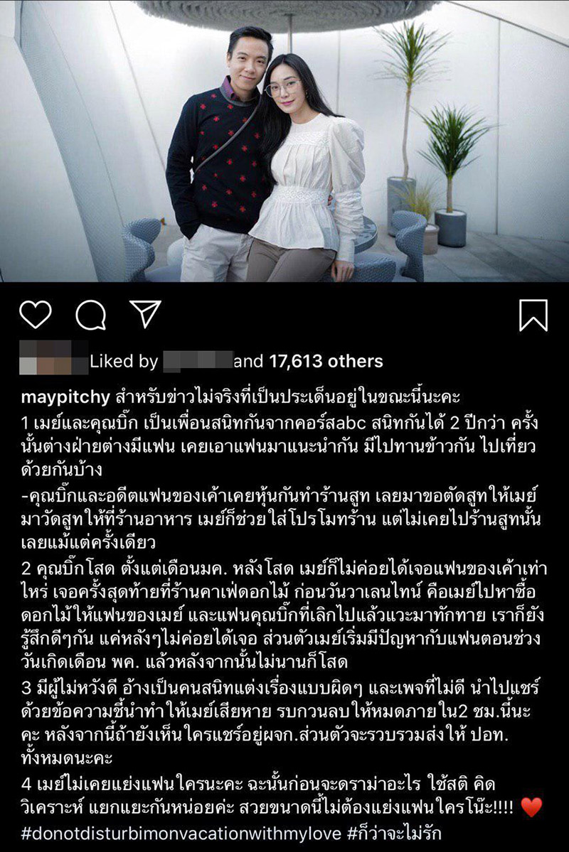 และสุดท้าย เมย์ฝากไว้แบบแซ่บ ๆ ว่า "เมย์ไม่เคยแย่งแฟนใครนะคะ ฉะนั้นก่อนจะดราม่าอะไร ใช้สติ คิด วิเคราะห์ แยกแยะกันหน่อยค่ะ สวยขนาดนี้ไม่ต้องแย่งแฟนใครโน๊ะ!!!! ♥️"