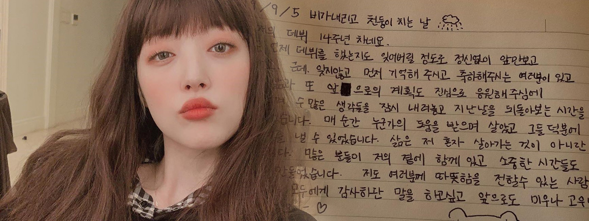 ทั้งนี้ ยังมีการพูดถึงจดหมายลายมือที่ ซอลลี่ ได้โพสต์ลงอินสตาแกรมส่วนตัวเมื่อวันที่ 5 กันยายน 2562 เนื่องในโอกาสครบรอบ 14 ปี กับการทำงานในวงการบันเทิงของเธอ โดยมีข้อความระบุว่า "วันนี้เป็นปีที่ 14 ที่ฉันเดบิวต์ในวงการบันเทิง ฉันหมกมุ่นอยู่กับการใช้ชีวิตและเกือบลืมไปว่าฉันอยู่ในวงการนี้นานเท่าไหร่แล้ว แต่ต้องขอบคุณคนที่มีความปรารถนาที่ดีกับฉันที่ช่วยเตือนฉันเรื่องนี้