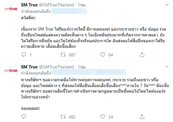 ทาง บริษัท เอสเอ็ม ทรู จำกัด ขอเรียนแจ้งให้ทราบว่า หากท่านใดได้กระทำการดังที่กล่าวมาข้างต้น ขอให้หยุดการเผยแพร่, กระจาย รวมถึงลบข่าวหรือข้อมูล และโพสต์ต่าง ๆ ในทันที มิฉะนั้นทางบริษัทจะดำเนินการตามกฎหมายต่อผู้ที่ทำให้ชื่อเสียงของศิลปินและบริษัทเสื่อมเสีย โดยไม่ต้องแจ้งให้ทราบล่วงหน้า