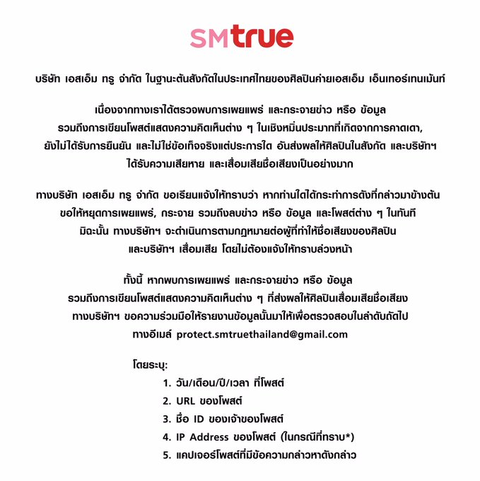ทั้งนี้ หากพบการเผยแพร่และกระจายข่าวหรือข้อมูล รวมถึงการเขียนโพสต์แสดงความคิดเห็นต่าง ๆ ที่ส่งผลให้ศิลปินเสื่อมเสียชื่อเสียง ทางบริษัทขอความร่วมมือให้รายงานข้อมูลนั้นมาให้เพื่อตรวจสอบในลำดับถัดไป ทางอีเมล protect.smtruethailand@gmail.com
