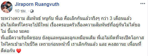 จากนั้นไม่นานก็ได้โพสต์ถึงความสัมพันธ์กับ เอ พศิน ระบุว่า "ความสัมพันธ์ระหว่างหนูกับพี่เอ คือเลิกกันแล้วจริง ๆ กว่า 3 เดือนแล้ว มันไม่ผิดที่ใครจะไปมีใหม่ เรื่องครอบครัวเรื่องความสัมพันธ์ที่อยู่กันไม่ได้ ขอไม่ชี้แจงนะคะ พี่เอมีความรับผิดชอบ ยังดูแลหนูและลูกเหมือนเดิม พี่เอไม่ผิดที่จะเปิดโอกาสให้ใครเข้ามาในชีวิต เพราะก่อนหน้านี้เราเลิกกันแล้ว และคงสถานะเพื่อนที่ดีต่อกัน"