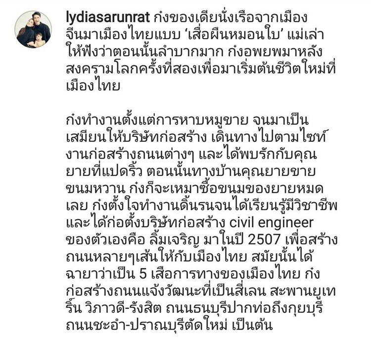 โดยเมื่อวันที่ 19 ตุลาคม 2562 สาวลีเดียได้โพสต์อินสตาแกรมไว้อาลัยคุณตา พร้อมเล่าว่า ก๋งนั่งเรือมาจากเมืองจีนแบบเสื่อผืนหมอนใบ มาเริ่มต้นชีวิตใหม่ที่เมืองไทยในสมัยสงครามโลกครั้งที่ 2