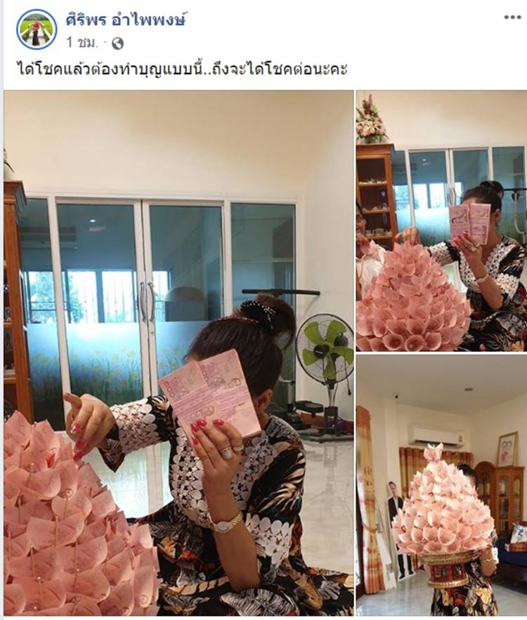 โดยหลังจากรับทรัพย์จากการถูกหวยแล้ว พี่นาง ก็ได้นำเงินมาทำบุญ พร้อมบอกกับแฟน ๆ ด้วยว่า "ได้โชคแล้วต้องทำบุญแบบนี้..ถึงจะได้โชคต่อนะคะ"