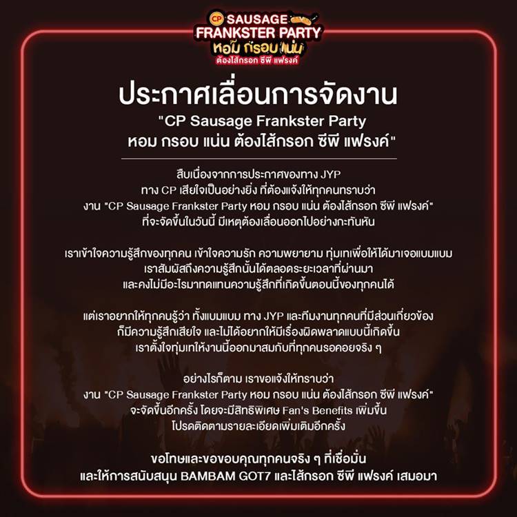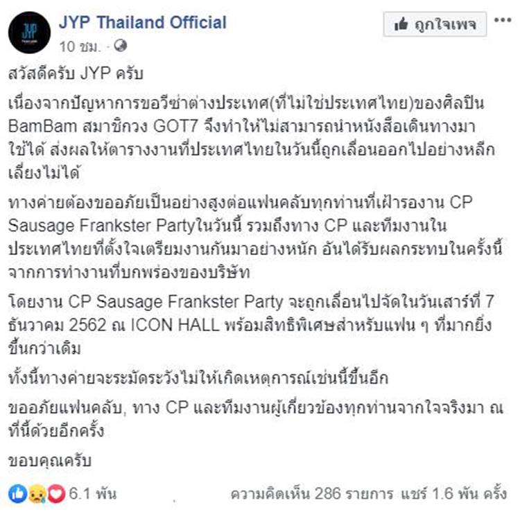 หลังจากที่ JYP Entertainment ประกาศเลื่อนงานอีเวนต์ของหนุ่ม "แบมแบม GOT7" ที่จะมีขึ้นในวันนี้ (2 พฤศจิกายน 2562) อย่างกะทันหัน เนื่องจากติดปัญหาเรื่องวีซ่าและพาสปอร์ต ซึ่งทาง JYP Entertainment ก็ได้ออกมายอมรับผิดว่า ปัญหาที่เกิดขึ้น เป็นความผิดของทางค่าย ซึ่งทางค่ายได้ขอโทษแฟน ๆ ทุกคนที่เดินทางไปรอที่งาน รวมถึงขอโทษไปยังบริษัทผู้จัดงานของไทย ทั้งนี้ กิจกรรมดังกล่าวจะเลื่อนไปเป็นวันที่ 7 ธันวาคม 2562 และยืนยันว่าจะไม่ให้เกิดความผิดพลาดแบบนี้ขึ้นอีก