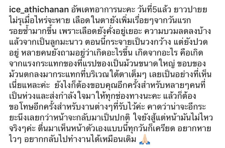 พร้อมเล่าเหตุการณ์อีกครั้งว่า อุบัติเหตุเกิดจากแรงกระแทกของม้วนแรปขนาดใหญ่ ขอบของม้วนตกลงมากระแทกที่บริเวณใต้ตาเต็ม ๆ เลยบาดเจ็บอย่างที่เห็น พร้อมขอบคุณหลายคนที่เป็นห่วง และส่งกำลังใจมาให้จากทุกช่องทาง รวมถึงขอโทษสำหรับงานต่าง ๆ ที่รับไว้ ซึ่งคาดว่าน่าจะใช้เวลาอีกสักระยะ กว่าหน้าจะกลับมาเป็นปกติ ใจยังสู้ แต่หน้าไม่ไหวจริง ๆ ตื่นมาเห็นหน้าตัวเองแบบนี้ทุกวันก็เครียด อยากหายไว ๆ อยากกลับไปทำงานได้เหมือนเดิม