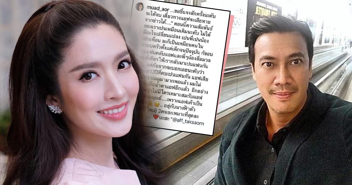 โดยในข้อความได้ระบุไว้ว่า "ขอชี้แจงสักครั้งนะครับจะได้จบ เดี๋ยวทางแอฟจะเสียหายจากข่าวได้ ตอนนี้ความสัมพันธ์ของเราเป็นเหมือนเดิมนะครับ ไม่ได้มีอะไรเปลี่ยนแปลง เป็นพี่เป็นน้องเป็นเพื่อน ละก็เป็นเหมือนคนในครอบครัวตั้งแต่เด็กจนปัจจุบัน ก็ขอบคุนแฟนคลับแอฟและพี่ ๆ น้องสื่อมวลชนที่เชียร์ให้เรากับมาเป็นแฟนกัน แต่ก็อยากจะบอกเลยนะครับว่า ตลอด 13 ปีที่คบเป็นแฟนกัน แอฟเสียใจเพราะผมมามากพอแล้ว ผมไม่อยากเห็นน้ำตาแอฟอีกแล้ว