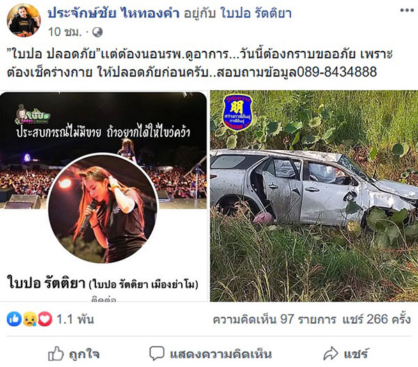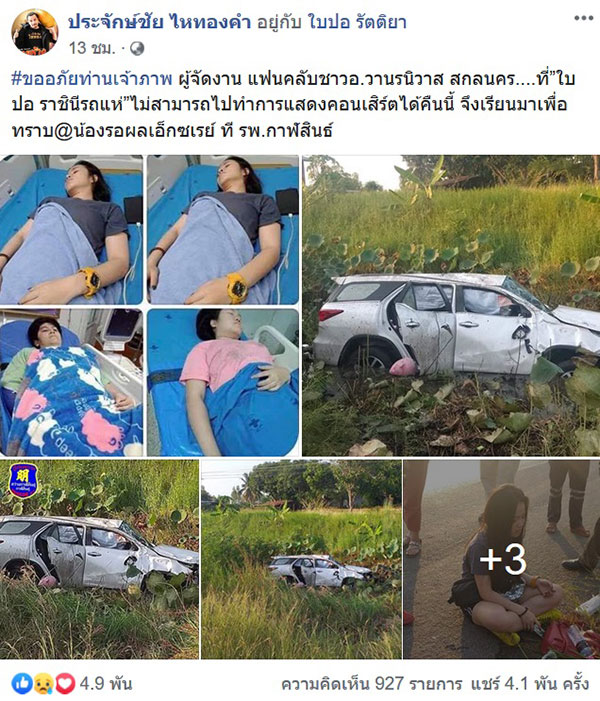 ใบปอ รัตติยา อยู่ในรถฟอร์จูนเนอร์ ชนมอเตอร์ไซค์เสียชีวิต 1 ราย ล่าสุดบาดเจ็บ รักษาตัวที่ รพ.กาฬสินธุ์ ต้องงดจัดคอนเสิร์ต