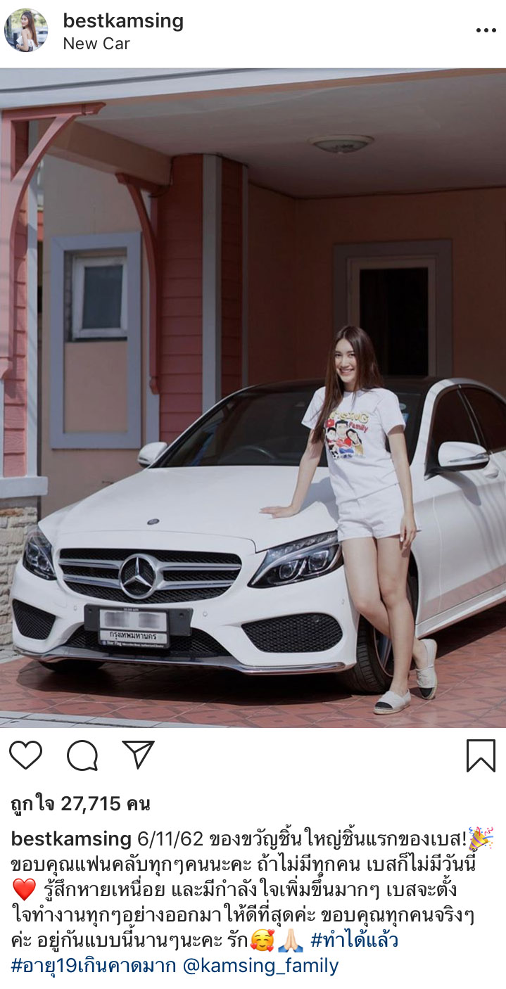 ล่าสุด (6 พฤศจิกายน 2562) น้องเบส ถอยรถเบนซ์สุดหรูป้ายแดง เพื่อเป็นของขวัญให้กับตัวเองด้วยวัยเพียง 19 ปี งานนี้ปลื้มปริ่มกันทั้งครอบครัว โดยน้องเบสถ่ายรูปคู่กับรถคันงาม ที่ได้จากน้ำพักน้ำแรงของตนเอง พร้อมเผยว่า