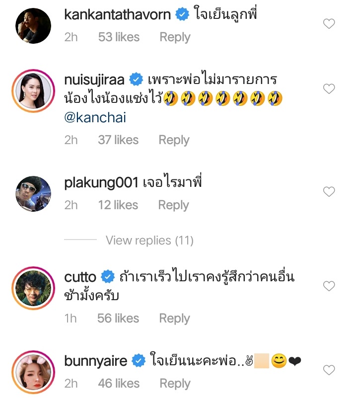 ขณะที่พี่น้องดาราต่างก็เข้ามาแสดงความเป็นห่วงกันหลายคน อาทิ พิธีกรคนดังอย่าง กันต์ กันตถาวร ที่เข้ามาคอมเมนต์ว่า "ใจเย็นลูกพี่" ส่วนนักแสดงสาวรุ่นน้อง นุ้ย สุจิรา ก็เข้ามาคอมเมนต์แบบคลายเครียดว่า "เพราะพ่อไม่มารายการน้องไง น้องแช่งไว้" ส่วน คัตโตะ ลิปตา ก็เข้ามาคอมเมนต์ในแนวปรัชญาว่า "ถ้าเราเร็วไป เราคงรู้สึกว่าคนอื่นช้ามั้งครับ" อีกทั้ง ดีเจพล่ากุ้ง และ แอร์ ภัณฑิลา ก็เข้ามาให้กำลังใจอีกด้วย