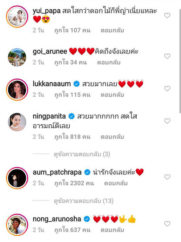 งานนี้ก็มีเพื่อน ๆ ดารา เข้ามาคอมเมนต์ชมกันเพียบ ขณะที่ อั้ม พัชราภา ก็ได้มาคอมเมนต์ว่า "น่ารักจังเลยค่ะ" นับเป็นอีกหนึ่งมิตรภาพดี ๆ ของทั้ง 2 สาว ที่แฟน ๆ เห็นแล้วยิ้มตามกันเลยทีเดียว ^^