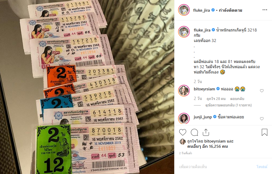 ล่าสุด (16 พฤศจิกายน 2562) ก็ดูเหมือนว่าลูกสาวสุดที่รักจะให้โชคซะแล้ว หลัง หนุ่มฟลุค ออกมาเผยภาพลอตเตอรี่กว่า 10 ใบ ในอินสตาแกรมและบอกว่า เกือบจะถูกลอตเตอรี่ซะแล้ว "น้ำหนักแรกเกิดจูนี่ 3218 กรัม เลขที่ออก 32 แต่อิพ่อเล่น 18 และ 81 หมดแผงครับ หา 32 ไม่มีจริง ๆ นี่ให้เงินพ่อแล้ว แต่ดวงพ่อมันไม่ถึงเอง" ทำเอาแฟน ๆ เข้ามาคอมเมนต์กันเพียบ พร้อมบอกว่าอย่าลืมตามไปเรื่อย ๆ อาจจะถูกก็ได้