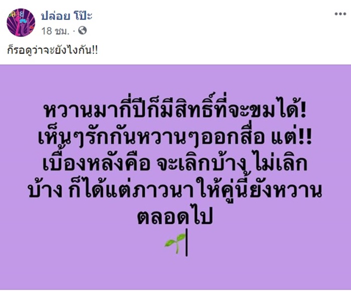 มีข่าวเมาท์แซ่บ ๆ ของคนในวงการมาให้ได้ติดตามกันอีกแล้ว โดยทางเพจดัง ปล่อย โป๊ะ ได้ออกมาโพสต์ข้อความว่า "หวานมากี่ปีก็มีสิทธิ์ที่จะขมได้ ! เห็น ๆ รักกันหวาน ๆ ออกสื่อ แต่ !! เบื้องหลังคือ จะเลิกบ้าง ไม่เลิกบ้าง ก็ได้แต่ภาวนาให้คู่นี้ยังหวานตลอดไป"