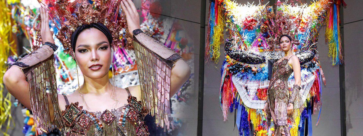 โดยชุดผีตาโขน สำหรับเวที Miss Universe 2019 เป็นชุดที่มีความงดงามร่วมสมัย นำเสนอลวดลายผ้าของภาคอีสาน ผ่านกระบวนการปักหลายเทคนิคเพื่อให้ความรู้สึกตระการตา ส่วนเครื่องศีรษะออกแบบให้มีความสูง 2.5 เมตร ใช้สื่อผสมวัสดุนานาชนิด โดยไม่มีการวาดลวดลายลงบนหน้ากาก แต่คงไว้ซึ่งจุดเด่นของชุดผีตาโขนโดยให้ครอบศีรษะลักษณะคล้ายหวดนึ่งข้าวเหนียว ใบหน้ายาว และมีจมูกโค้งงอ ตกแต่งความงามตามที่ศิลปินต้องการรังสรรค์ และให้สื่อถึงความสนุกสนานบันเทิง