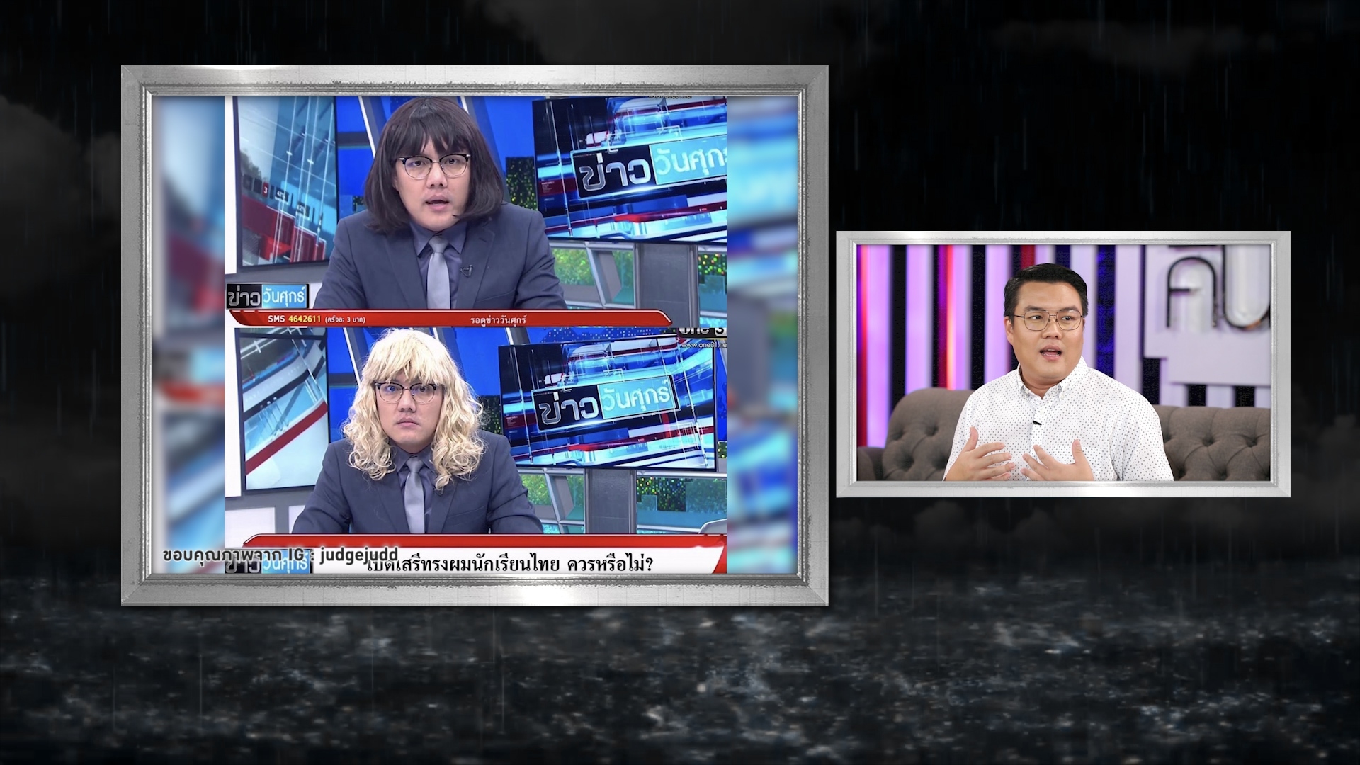 จั๊ด ธีมะ : วันที่ใส่วิก เป็นสัปดาห์ที่มีข่าวเกี่ยวกับประกาศระเบียบตัดผมของเด็กในโรงเรียน ผมคิดว่าเด็กเดี๋ยวนี้สาวเร็ว ให้เขาไปตัดถึงติ่งหู มันก็ไม่เกี่ยวกับเรื่องการเรียน เด็กผู้ชายเป็นหนุ่มแล้ว ไปไถซะน่าเกลียดเลย ผมก็คิดว่าจะเสนอข่าวนี้ยังไง เพราะทุกช่องเสนอข่าวแบบนี้เหมือนกันหมด ผมก็เลยเปรียบเทียบว่าถ้าผมใส่วิกแล้วผมมานั่งรายงานข่าว เวลาคุณดูผม คุณดูข่าวหรือดูวิกที่ผมใส่ล่ะ