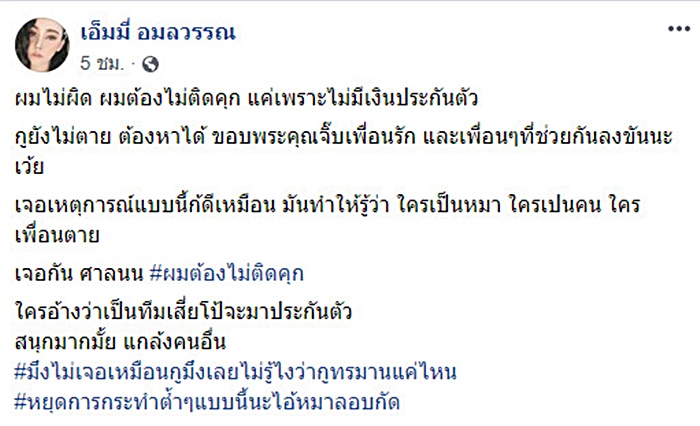 นอกจากนี้ เอ็มมี่ ยังได้โพสต์อีกว่า "ผมไม่ผิด ผมต้องไม่ติดคุก แค่เพราะไม่มีเงินประกันตัว กูยังไม่ตาย ต้องหาได้ ขอบพระคุณเพื่อน ๆ ที่ช่วยกันลงขันนะ เจอเหตุการณ์แบบนี้ก็ดีเหมือนกัน เพราะทำให้รู้ว่าใครเป็นหมา ใครเป็นคน ใครคือเพื่อนตาย ส่วนใครอ้างว่าเป็นทีมเสี่ยโป้ จะมาประกันตัวให้นั้น สนุกมากไหมที่แกล้งคนอื่น" และทิ้งท้ายว่า "มึงไม่เจอเหมือนกู มึงเลยไม่รู้ไงว่ากูทรมานแค่ไหน หยุดการกระทำต่ำ ๆ แบบนี้นะไอ้หมาลอบกัด"