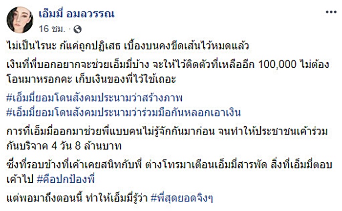 เอ็มมี่ยอมโดนสังคมประณามว่าสร้างภาพ ยอมโดนสังคมประณามว่าร่วมมือกันหลอกเอาเงิน การที่เอ็มมี่ออกมาช่วยพี่ แบบคนไม่รู้จักกันมาก่อน จนทำให้ประชาชนเค้าร่วมกันบริจาค 4 วัน 8 ล้านบาท ทั้งที่รอบข้างที่เค้าเคยสนิทกับพี่ ต่างโทร. มาเตือนเอ็มมี่สารพัด สิ่งที่เอ็มมี่ตอบเค้าไปคือ ปกป้องพี่ แต่พอมาถึงตอนนี้ ทำให้เอ็มมี่รู้ว่า พี่สุดยอดจริง ๆ"
