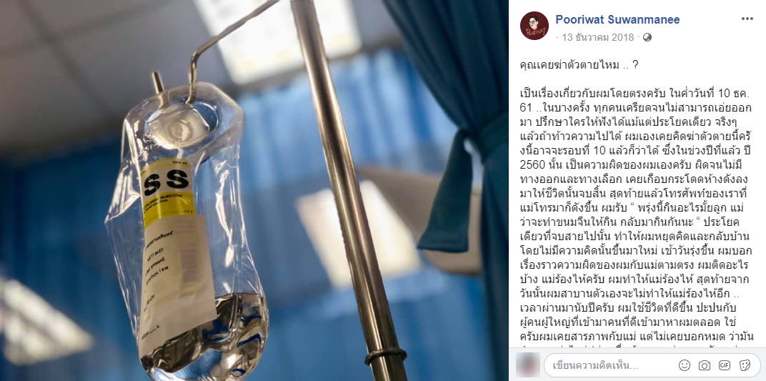 คุณเคยฆ่าตัวตายไหม ? เป็นเรื่องเกี่ยวกับผมโดยตรงครับ ในค่ำวันที่ 10 ธันวาคม 2561 ในบางครั้ง ทุกคนเครียดจนไม่สามารถเอ่ยออกมา ปรึกษาใครให้ฟังไม่ได้แม้แต่ประโยคเดียว จริง ๆ แล้วถ้าเท้าความไปได้ ผมเองเคยคิดฆ่าตัวตาย ครั้งนี้อาจจะรอบที่ 10 แล้วก็ว่าได้ ซึ่งในช่วงปีที่แล้ว ปี 2560 นั้น เป็นความผิดของผมเองครับ ผิดจนไม่มีทางออกและทางเลือก เคยเกือบกระโดดห้างดังลงมาให้ชีวิตนั้นจบสิ้น