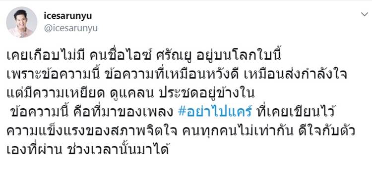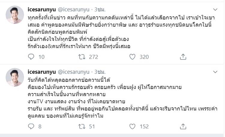 ล่าสุด (30 พฤศจิกายน 2562) นักร้องหนุ่ม ไอซ์ ศรัณยู ก็ได้ออกมาโพสต์ผ่านทวิตเตอร์ แชร์เรื่องราวของตนเอง ว่า