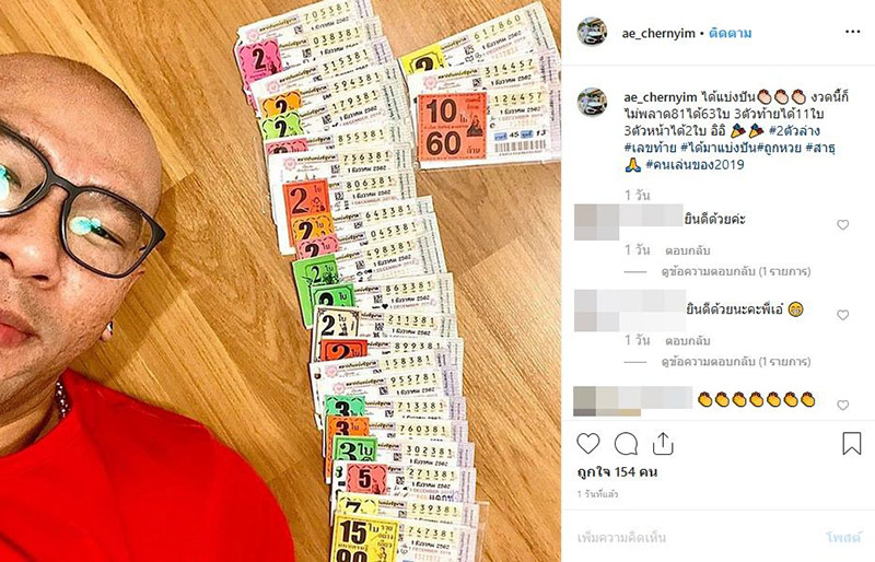 ทำเอาฮือฮาไม่น้อย สำหรับนักแสดงตลก เอ๋ เชิญยิ้ม หรือหลายคนอาจจะคุ้นตากับบท ผู้กองสมาร์ท จากซีรีส์ ผู้กองเจ้าเสน่ห์ ที่ล่าสุดเจ้าตัวได้ออกมาเปิดเผยในอินสตาแกรมส่วนตัวว่า ได้ถูกรางวัลลอตเตอรี่ประจำงวดวันที่ 1 ธันวาคม 2562 แบบรับโชคครั้งใหญ่เกือบ 100 ใบ