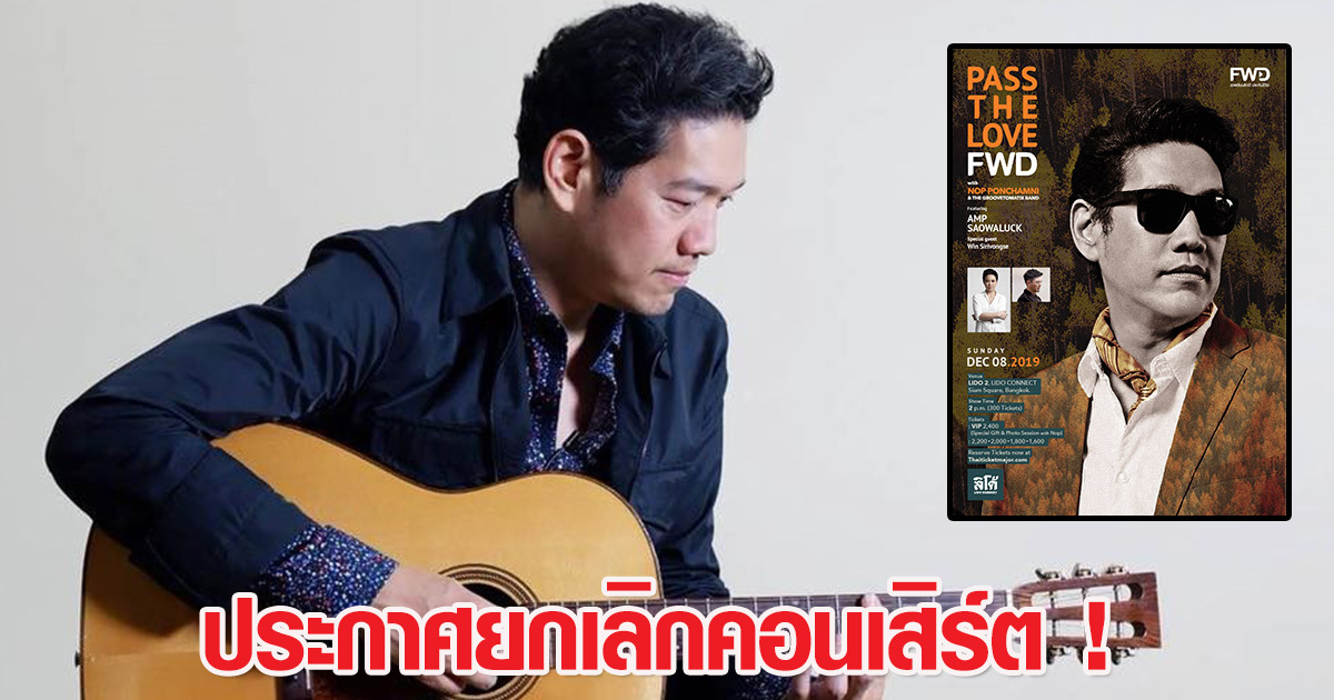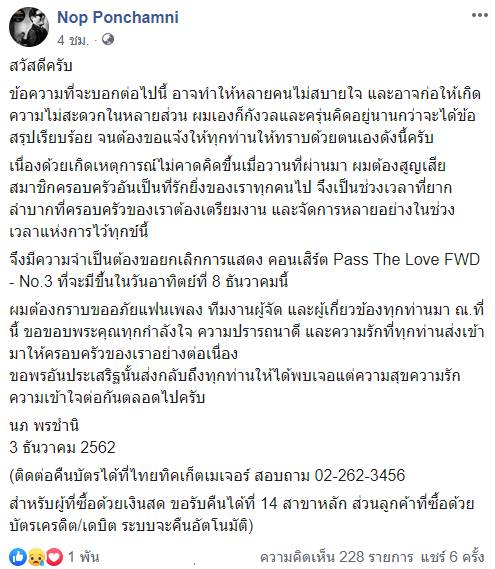 นับว่าเป็นข่าวเศร้า สำหรับนักร้องหนุ่ม นภ พรชำนิ ครอบครัว และแฟน ๆ เมื่อล่าสุด (3 ธันวาคม 2562) เจ้าตัวได้ออกมาประกาศยกเลิกคอนเสิร์ต Pass The Love FWD - No.3 ที่จะมีขึ้นในวันอาทิตย์ที่ 8 ธันวาคม นี้ ที่จะจัดแสดงที่ Lido Connect