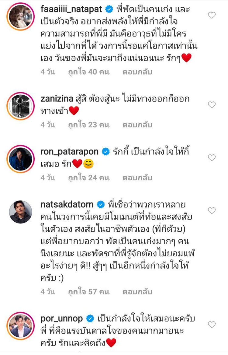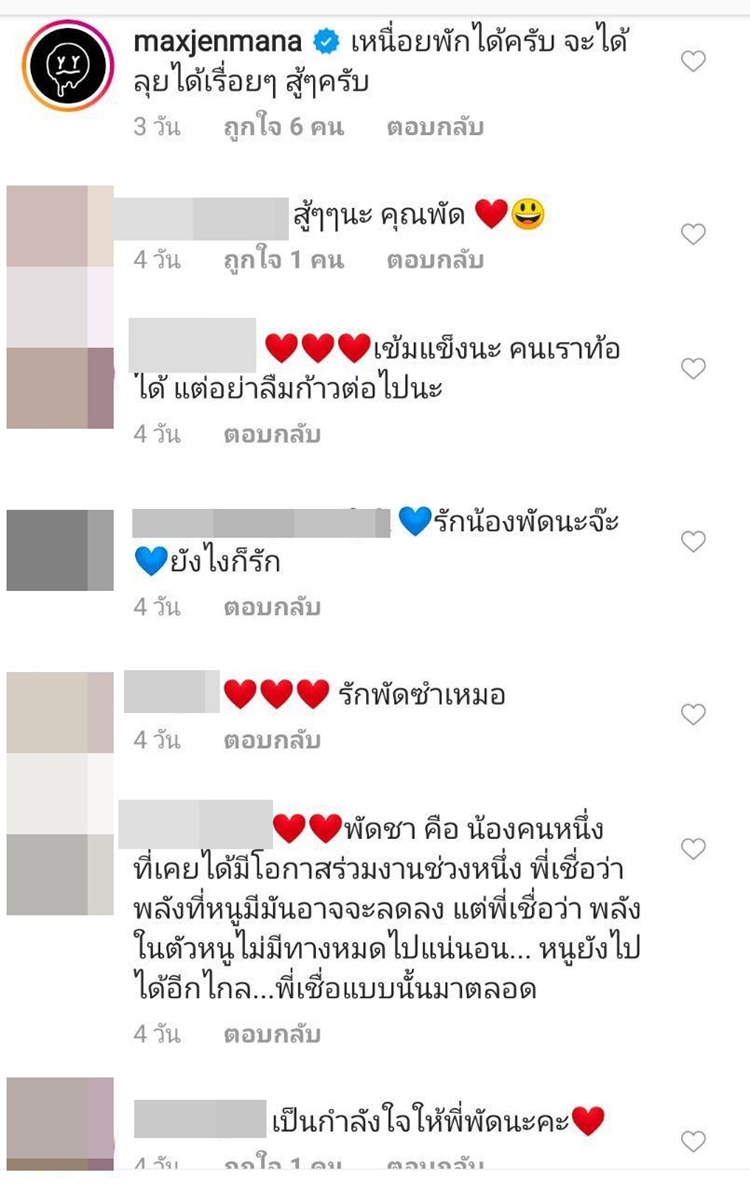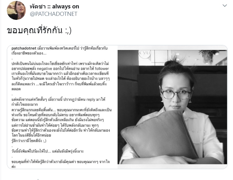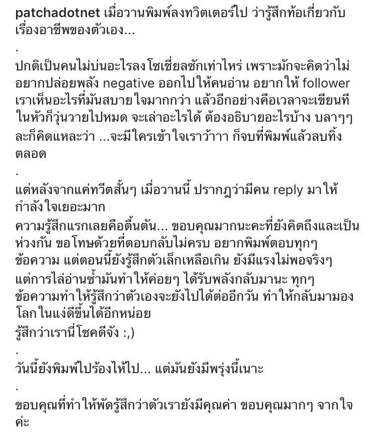 โดยหลังจากได้รับกำลังใจจากหลาย ๆ คน พัดชา AF ก็ได้โพสต์ข้อความผ่านอินสตาแกรม เปิดใจถึงเรื่องดังกล่าว พร้อมขอบคุณทุกกำลังใจที่ส่งมาให้ ดังนี้