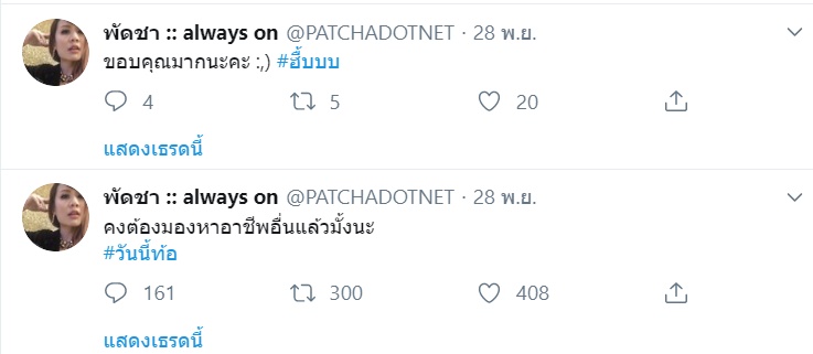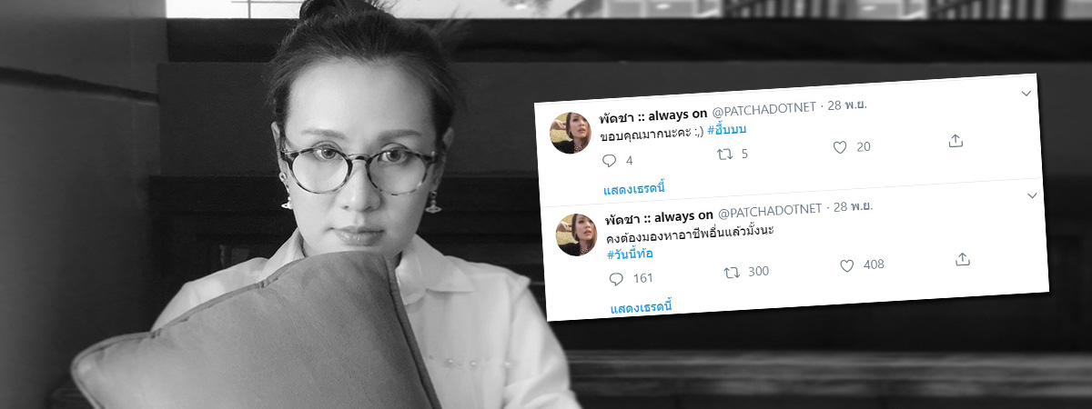 ทำเอาหลายคนเห็นแล้วเป็นห่วง เมื่อนักร้องสาว พัดชา AF โพสต์ข้อความดูเศร้า ๆ ในทวิตเตอร์ว่า "คงต้องมองหาอาชีพอื่นแล้วมั้งนะ #วันนี้ท้อ" ซึ่งก็มีแฟน ๆ เข้าไปคอมเมนต์ให้กำลังใจกันอย่างล้นหลาม บอกว่าชื่นชอบเวลาพัดชาร้องเพลง และขอให้สู้ ๆ