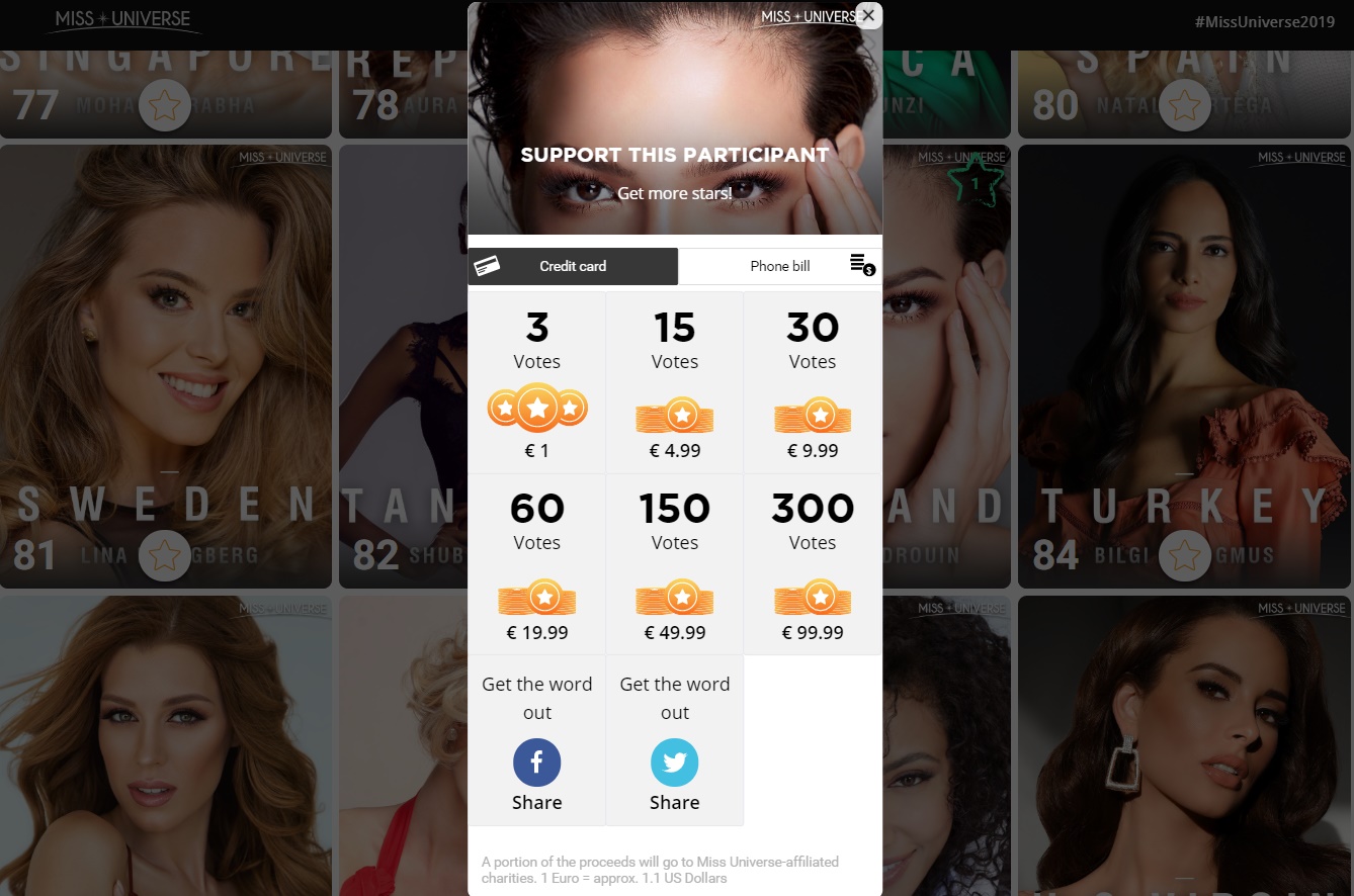 - เลือก Packages ในการ Vote ได้ ซึ่งวิธีการชำระเงินสามารถทำได้ 2 ช่องทาง คือ ตัดบัตรเครดิต หรือชำระผ่านผู้ให้บริการสัญญาณโทรศัพท์มือถือ