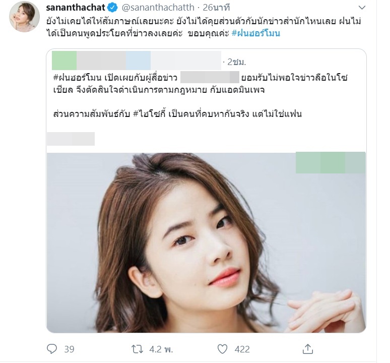 ทั้งนี้ ฝน ศนันธฉัตร ได้ตอบกลับถึงสำนักข่าวดังกล่าวว่า "ยังไม่เคยได้ให้สัมภาษณ์เลยนะคะ ยังไม่ได้คุยส่วนตัวกับนักข่าวสำนักไหนเลย ฝนไม่ได้เป็นคนพูดประโยคที่ข่าวลงเลยค่ะ ขอบคุณค่ะ"