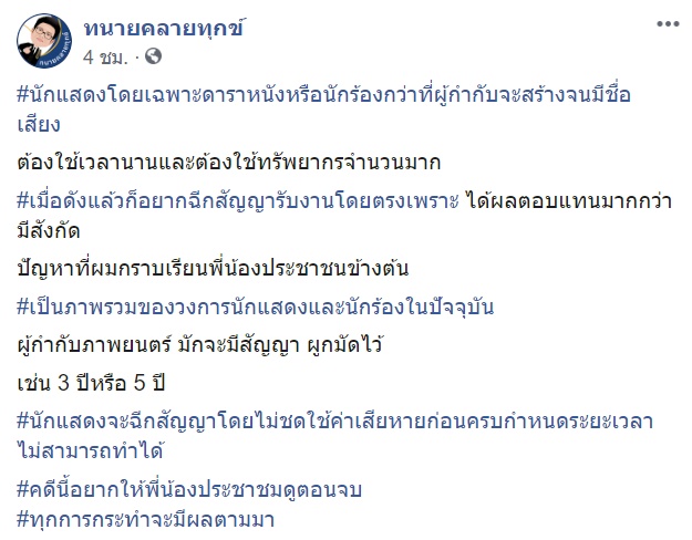 พร้อมยืนยันว่า ตอนนี้สัญญายังมีผลผูกพันกันเหมือนเดิม นิกยังไม่สามารถไปรับงานแสดงได้ เพราะถ้ารับจะใช้สิทธิ์ทางศาลเอาผิดนักแสดง และผู้ว่าจ้างต่อไป