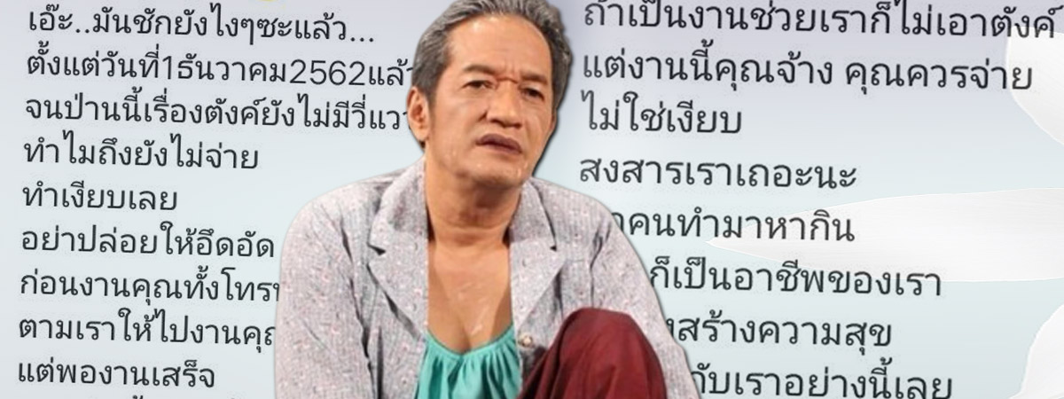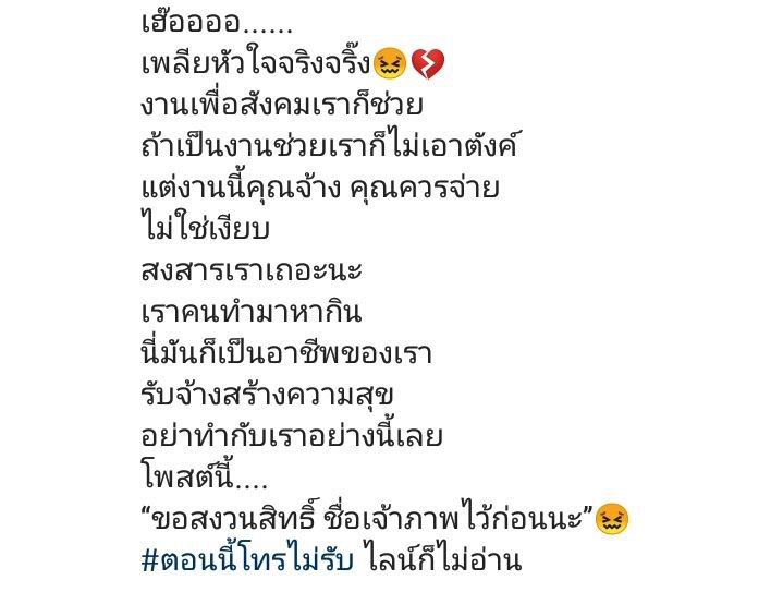 โดยตนทั้งโทรศัพท์ไปหาก็แล้ว ส่งข้อความไปในไลน์ก็แล้ว แต่ผู้ว่าจ้างก็ทำเงียบหาย ไม่ยอมจ่ายเงิน อย่างไรก็ตาม ถ้าเป็นงานเพื่อสังคม ตนก็ช่วยแบบไม่คิดเงิน แต่งานนี้คุณเป็นคนจ้าง ก็ควรจ่ายเงิน ไม่ใช่เงียบหาย จึงอยากให้สงสารตนบ้าง เพราะตนก็ทำมาหากินเหมือนกัน และนี่เป็นอาชีพของตน ตนรับจ้างสร้างความสุข อย่าทำกับตนอย่างนี้เลย