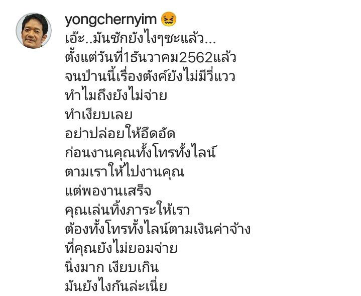 ทำเอา โย่ง เชิญยิ้ม ตลกคนดังถึงกับขำไม่ออก เพราะมีแววว่าจะถูกเบี้ยวเงินค่าตัวซะแล้ว โดยล่าสุด (7 ธันวาคม 2562) น้าโย่งได้ออกมาโพสต์ข้อความตัดพ้อลงบนอินสตาแกรมส่วนตัว ระบุว่า ตั้งแต่วันที่ 1 ธันวาคม ที่ผ่านมา จนถึงตอนนี้ เจ้าภาพก็ยังไม่มีวี่แววว่าจะติดต่อมาเรื่องจ่ายเงินค่าจ้างงานเลย