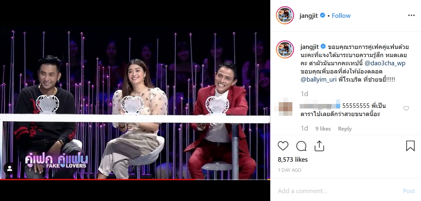 อย่างไรก็ตาม จากการตรวจสอบไปยังอินสตาแกรมของสาวแจง พบว่าเจ้าตัวได้โพสต์ข้อความหลังรายการออนแอร์ โดยระบุว่า "ขอบคุณรายการคู่เฟคคู่แฟนด้วยนะคะที่แจงได้มาระบายความรู้สึก หมดเลยค่ะ ด่าผัวมันมากค่ะเทปนี้ @dao3cha_wp ขอบคุณพี่บอลที่ส่งให้น้องตลอด @ballyim_uri พี่โรเบิร์ต ที่ช่วยขยี้!!!!!"