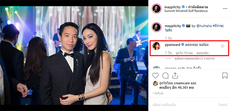 อย่างล่าสุด (15 ธันวาคม 2562) สาวเมย์ ก็เพิ่งควง หนุ่มบิ๊ก ไปร่วมแสดงความยินดีในงานแต่งงานของ สาวบี มาติกา พร้อมถ่ายรูปคู่กันสุดหวานไม่แพ้คู่เจ้าบ่าวเจ้าสาวตัวจริง ทำเอาเพื่อนซี้อย่างคุณแม่คนสวย เป้ย ปานวาด ถึงกับอดรนทนไม่ไหวต้องเข้ามาคอมเมนต์แซวคู่เลิฟคู่นี้ว่า "แต่งเหอะ ขอร้อง" แถมยังมีแฟน ๆ เข้ามาร่วมด้วยช่วยคอมเมนต์เห็นด้วยและช่วยเชียร์ให้ทั้งคู่มีข่าวดีด้วยกันเร็ว ๆ เพียบ พร้อมบอกว่าทั้งคู่หน้าคล้ายกันมาก นี่แหละเนื้อคู่แน่นอน