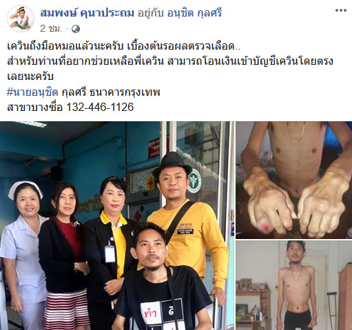 ทั้งนี้ อี๊ด ยังได้เผยอีกว่า หากใครที่มีจิตเมตตาอยากช่วยเหลือ เควิน สามารถโอนเงินเข้าบัญชีเควินโดยตรง ชื่อบัญชี นายอนุชิต กุลศรี ธนาคารกรุงเทพ สาขาบางซื่อ 132-446-1126