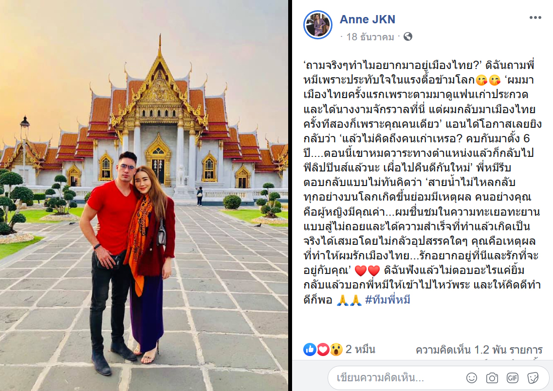 แอนโพสต์แคปชั่นระบุว่า ตนถามฝ่ายชายว่า ทำไมถึงมาอยู่เมืองไทย ซึ่งเขาก็ตอบกลับมาว่า
