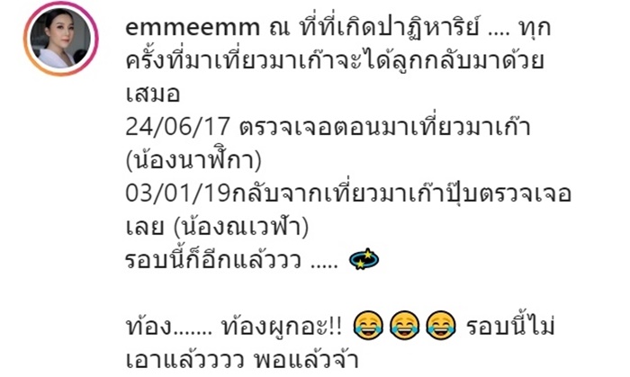 แต่งานนี้สาวเอ็ม ทำแฟนคลับแอบลุ้น เพราะเจ้าตัวเผยว่า "ณ ที่ที่เกิดปาฏิหาริย์ .... ทุกครั้งที่มาเที่ยวมาเก๊าจะได้ลูกกลับมาด้วยเสมอ 24/06/17 ตรวจเจอตอนมาเที่ยวมาเก๊า (น้องนาฬิกา), 03/01/19 กลับจากเที่ยวมาเก๊าปุ๊บตรวจเจอเลย (น้องณเวฬา) รอบนี้ก็อีกแล้ววว ..... ท้อง....... ท้องผูกอะ !! รอบนี้ไม่เอาแล้วววว พอแล้วจ้า"