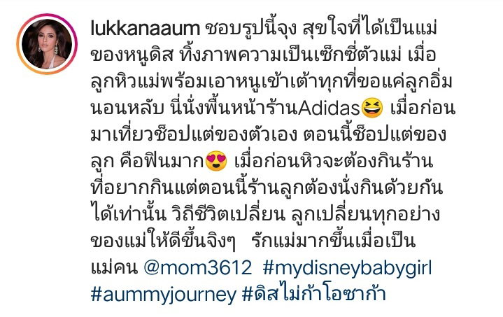 "ชอบรูปนี้จุง สุขใจที่ได้เป็นแม่ของหนูดิส ทิ้งภาพความเป็นเซ็กซี่ตัวแม่ เมื่อลูกหิวแม่พร้อมเอาหนูเข้าเต้าทุกที่ขอแค่ลูกอิ่มนอนหลับ นี่นั่งพื้นหน้าร้าน Adidas เมื่อก่อนมาเที่ยวช้อปแต่ของตัวเอง ตอนนี้ช้อปแต่ของลูก คือฟินมาก เมื่อก่อนหิวจะต้องกินร้านที่อยากกิน แต่ตอนนี้ร้านลูกต้องนั่งกินด้วยกันได้เท่านั้น วิถีชีวิตเปลี่ยน ลูกเปลี่ยนทุกอย่างของแม่ให้ดีขึ้นจริง ๆ รักแม่มากขึ้นเมื่อเป็นแม่คน"