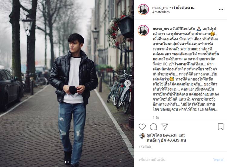 เรียกว่าฟาดเคราะห์รับปีใหม่เลยทีเดียว สำหรับ มาสุ จรรยางค์ดีกุล พระเอกหนุ่มหล่อตี๋ของช่อง 3 ที่ล่าสุด (1 มกราคม 2563) ได้ออกมาเล่าประสบการณ์ถูกคนร้ายรุมปล้น ขณะเดินทางไปเที่ยวในทริปปีใหม่ที่เมืองอัมสเตอร์ดัม ประเทศเนเธอร์แลนด์