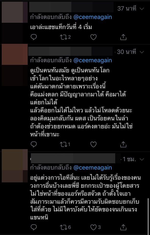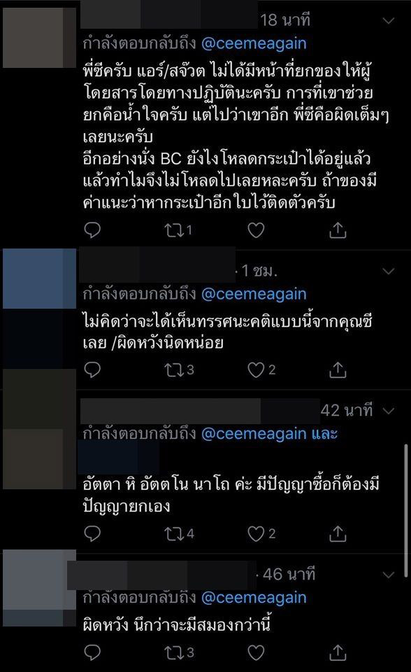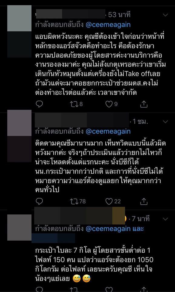ขณะที่ทางเพจเฟซบุ๊ก Drama-addict ได้ออกมาโพสต์เกี่ยวกับประเด็นเรื่องการยกกระเป๋าเก็บบนช่องเก็บสัมภาระบนเครื่องบิน โดยระบุว่า ทางสายการบินต่าง ๆ ได้เคยอธิบายไว้ว่าไม่ให้ใช้ลูกเรือยกกระเป๋า เพื่อเห็นแก่สุขภาพของลูกเรือ วันหนึ่งต้องเจอผู้โดยสารเป็นร้อย ๆ คน หากต้องคอยยกกระเป๋าให้ผู้โดยสารทุกคน อาจจะทำให้เกิดอาการบาดเจ็บ และป่วยเป็นหมอนรองกระดูกทับเส้นประสาทได้ บางคนถึงขั้นพิการหากรักษาไม่ทัน