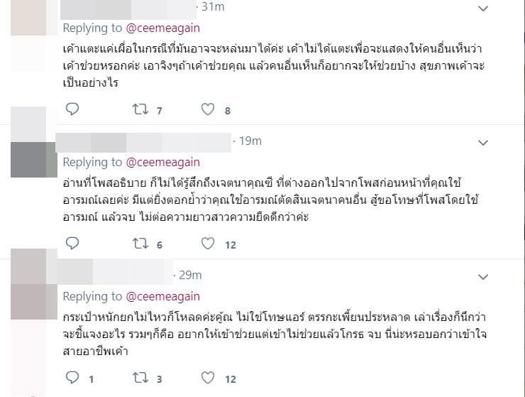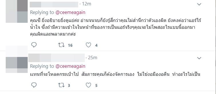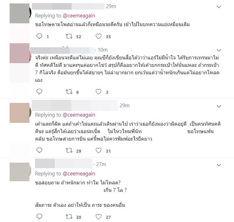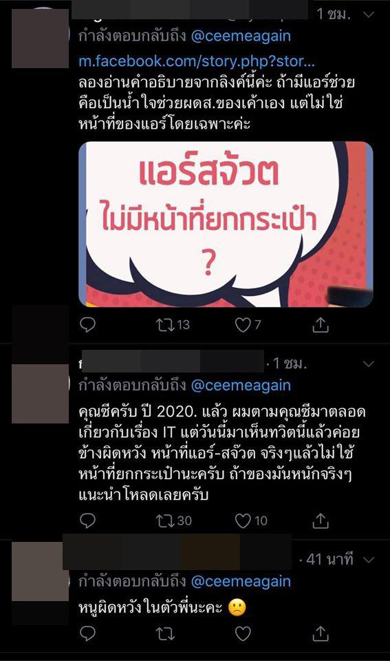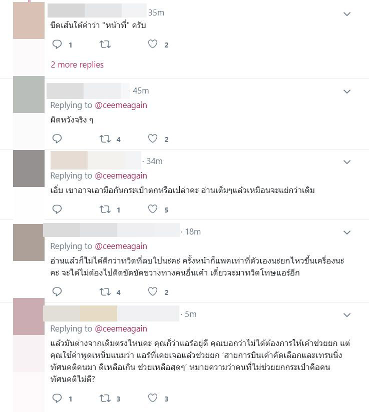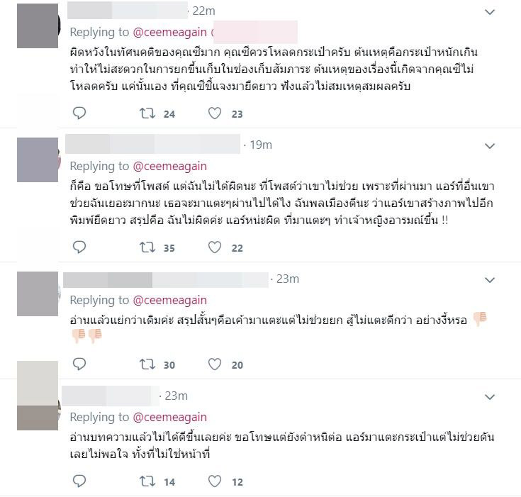 ทว่า ทางผู้ที่ได้อ่านคำชี้แจงก็ยังรู้สึกว่า ซี ฉัตรปวีณ์ กลับยิ่งรู้สึกแย่ลงกว่าเดิม ขอโทษที่โพสต์แต่ไม่ได้ขอโทษทางเจ้าหน้าที่ และต้องการตำหนิที่ไม่ได้รับการช่วยเหลือ ทั้ง ๆ ที่ความจริงแล้วต้นเหตุมาจากกระเป๋าของเธอที่มีน้ำหนักมาก แต่ไม่ยอมโหลดกระเป๋าเอง หวังว่าเจ้าหน้าที่จะช่วยเหลือ แต่เมื่อไม่ได้รับความพอใจ กลับมาต่อว่าเช่นนี้