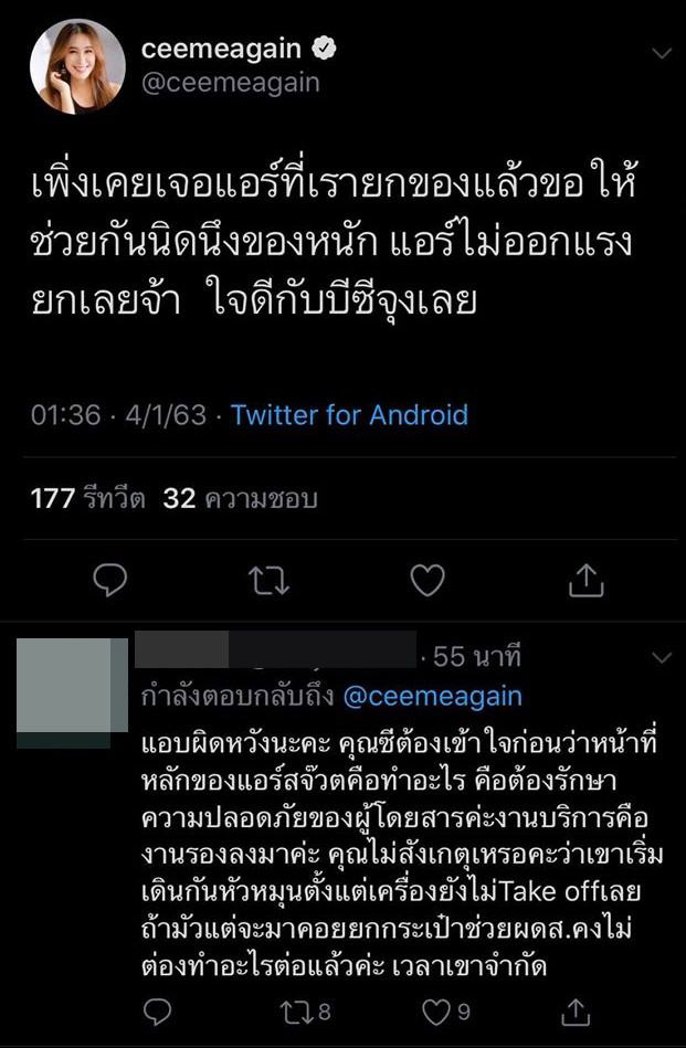 ซี ฉัตรปวีณ์ พิธีกรรายการไอทีชื่อดัง เจอดราม่าเข้าให้แล้ว เมื่อเธอได้ออกมาทวีตในวันที่ 4 มกราคม 2563 บอกว่า เจอแอร์โฮสเตสที่ไม่ช่วยยกกระเป๋าให้ โดยระบุว่า "เพิ่งเคยเจอแอร์ที่เรายกของแล้วขอให้ช่วยกันนิดนึงของหนัก แอร์ไม่ออกแรงยกเลยจ้า ใจดีกับบีซีจุงเลย"