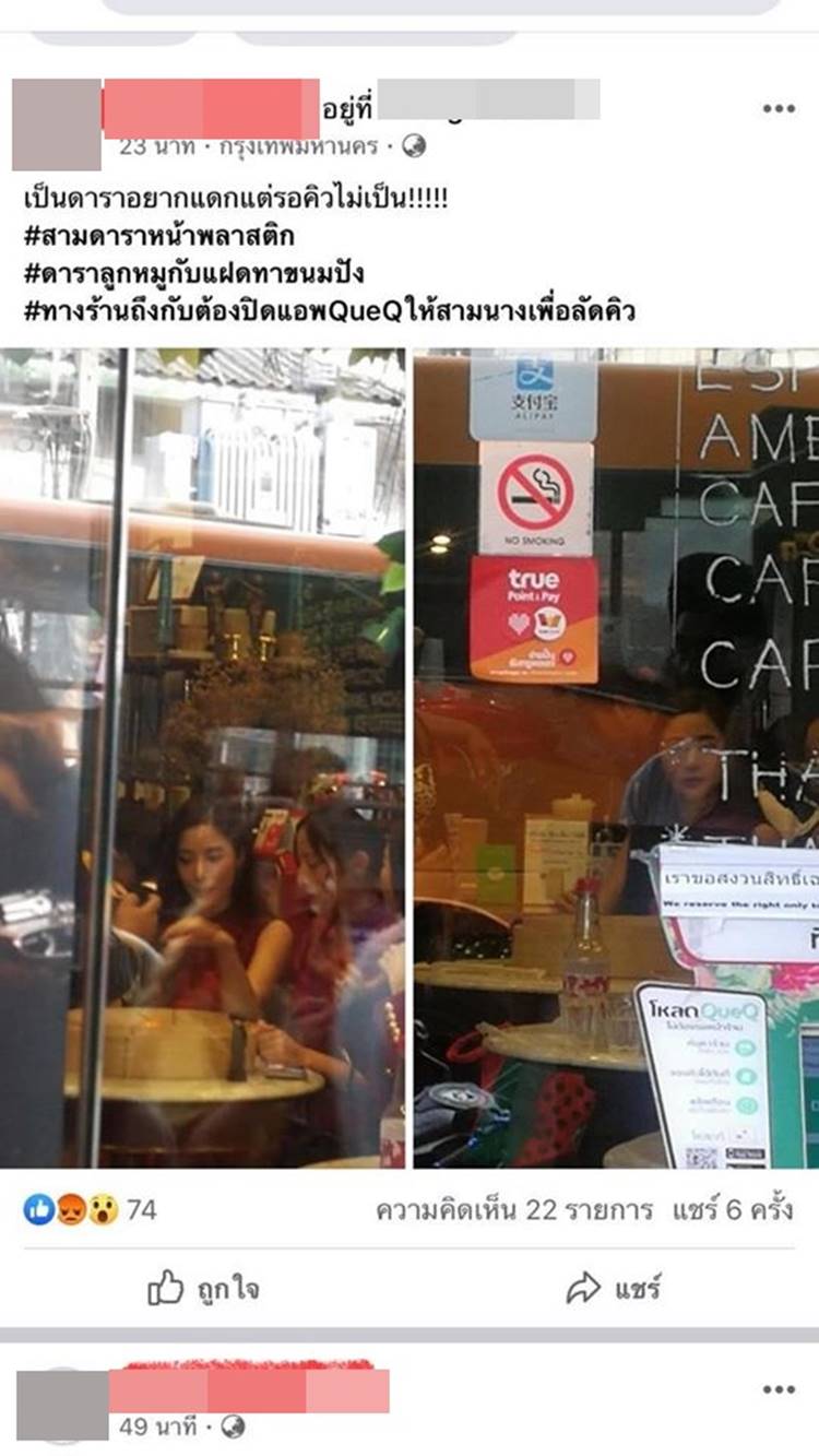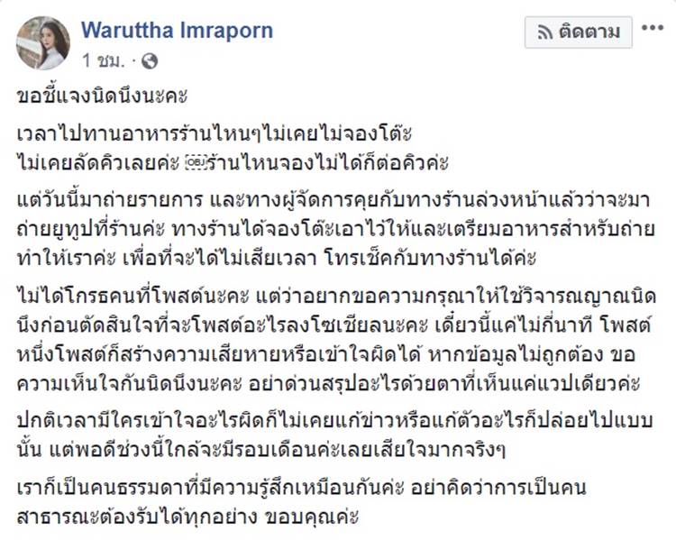 "ขอชี้แจงนิดนึงนะคะ เวลาไปทานอาหารร้านไหน ๆ ไม่เคยไม่จองโต๊ะ ไม่เคยลัดคิวเลยค่ะ ร้านไหนจองไม่ได้ก็ต่อคิวค่ะ