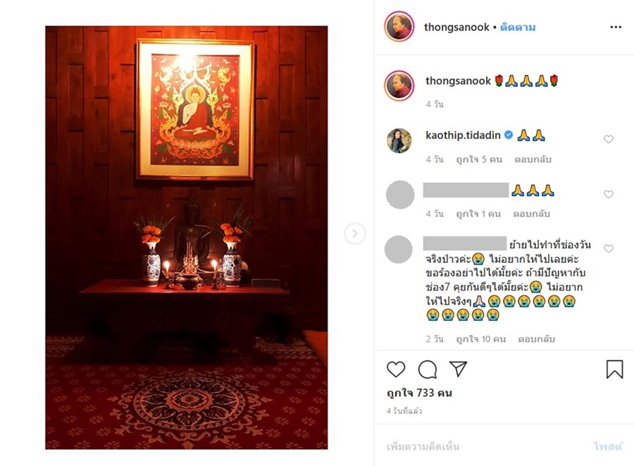 เมื่อล่าสุด ผู้จัดคนดังได้โพสต์ภาพโต๊ะหมู่บูชาพระพุทธรูป พร้อมกับเขียนแคปชั่นเป็นอีโมติคอนรูปการ์ตูนยกมือไหว้ ซึ่งก็มีทั้งดาราคนดังและแฟน ๆ มาร่วมอนุโมทนาบุญกันเพียบ แต่ก็มีอีกฝั่งที่ดราม่า หลังบางรายเข้ามาพูดถึงเกี่ยวกับเรื่องที่มีข่าวลือว่า ธงชัย ประสงค์สันติ เตรียมจะย้ายออกจากช่อง 7 ไปซบอีกค่ายซะอย่างนั้น