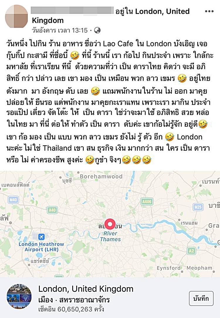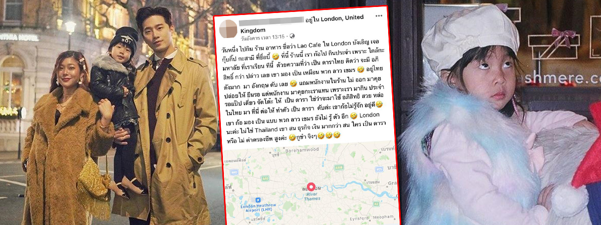 สาวโพสต์เหยียด กุ๊บกิ๊บ สุมณทิพย์ และ บี้ ธรรศภาคย์ อยู่เมืองนอกก็แค่คนธรรมดา หลังไปกินข้าวที่ร้านอาหารในลอนดอน แต่พนักงานมาดูแลเธอก่อน ข่มเป็นดาราใช่ว่าจะมีอภิสิทธิ์เหนือใคร