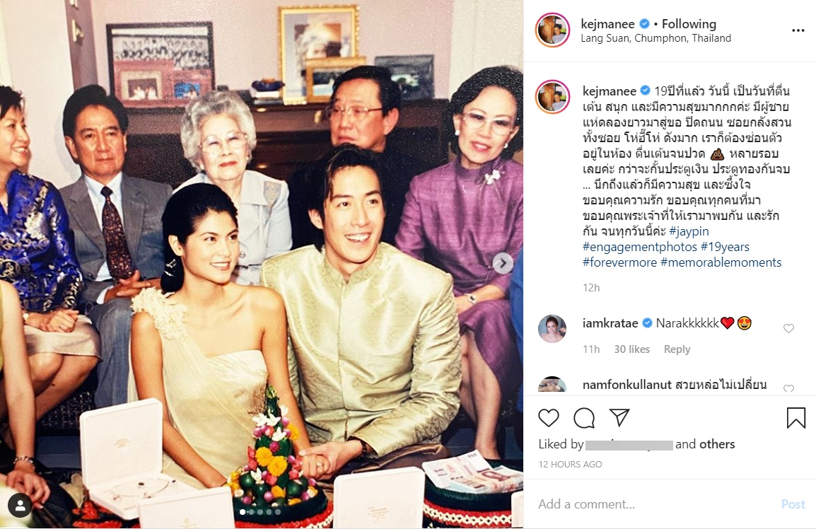 "19 ปีที่แล้ว วันนี้ เป็นวันที่ตื่นเต้น สนุก และมีความสุขมากกกค่ะ มีผู้ชายแห่กลองยาวมาสู่ขอ ปิดถนน ซอยหลังสวนทั้งซอย โห่ฮี้โห่ ดังมาก เราก็ต้องซ่อนตัวอยู่ในห้อง ตื่นเต้นจนปวด (อีโมจิรูปอึ) หลายรอบเลยค่ะ กว่าจะกั้นประตูเงิน ประตูทองกันจบ ... นึกถึงแล้วก็มีความสุข และซึ้งใจ ขอบคุณความรัก ขอบคุณทุกคนที่มา ขอบคุณพระเจ้าที่ให้เรามาพบกัน และรักกัน จนทุกวันนี้ค่ะ #jaypin #engagementphotos #19years #forevermore #memorablemoments"