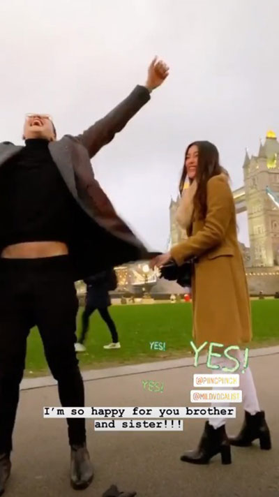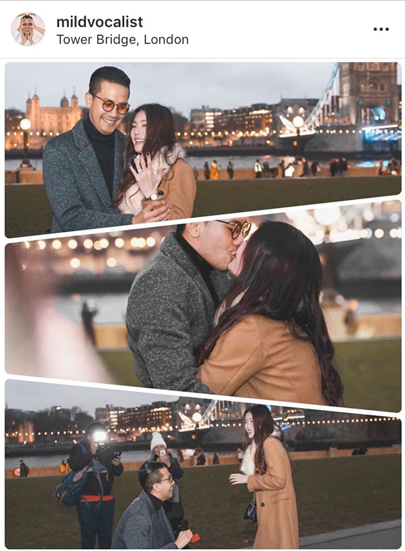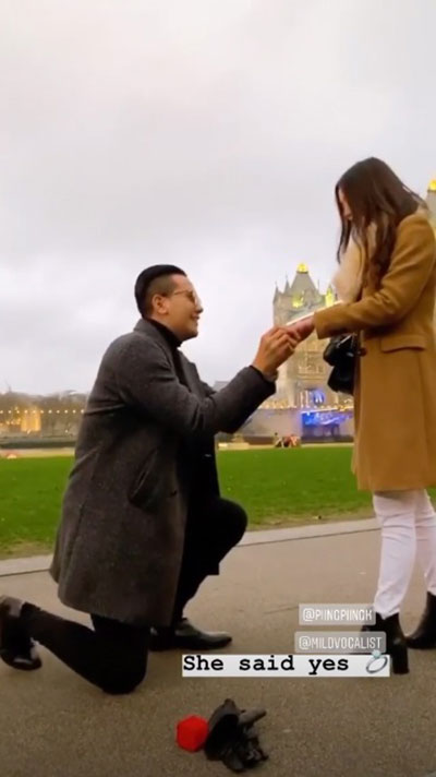 จากนั้นหนุ่มเป้ ได้โพสต์ภาพตอนขอแต่งงานและจูบกันอย่างโรแมนติก พร้อมแคปชั่นเนื้อเพลงเพราะ ๆ โดยมีเพื่อนในวงการและแฟนคลับเข้ามาแสดงความยินดีจำนวนมาก ขณะที่ น้องกร โพสต์รูปเดียวกัน พร้อมบอกว่าตรุษจีนปีนี้ได้สามีแทนอั่งเปา ความฝันตั้งแต่เด็กคืออยากแต่งงานไว ๆ และวันนี้มันเกิดขึ้นจริงแล้ว